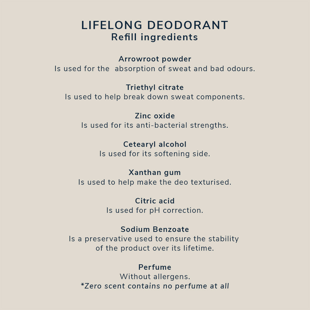Why these ingredients? We work with one of Europe's leading, sustainable, certified manufacturers that specialises in powdered personal care products. Our mission is to make a plastic-free deodorant that not only smells great but also works. Most natural deo's don't work so well and we tested many along the way. After lots of iterations, this was the best formula that kept you smelling great all day, without staining your clothes, nor causing any skin reactions.