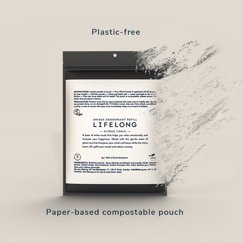 We package our powdered deodorant in plastic-free, paper based pouches. This eliminates single-use plastic packaging and stops it from polluting our planet.