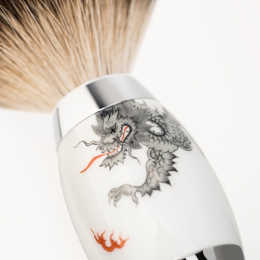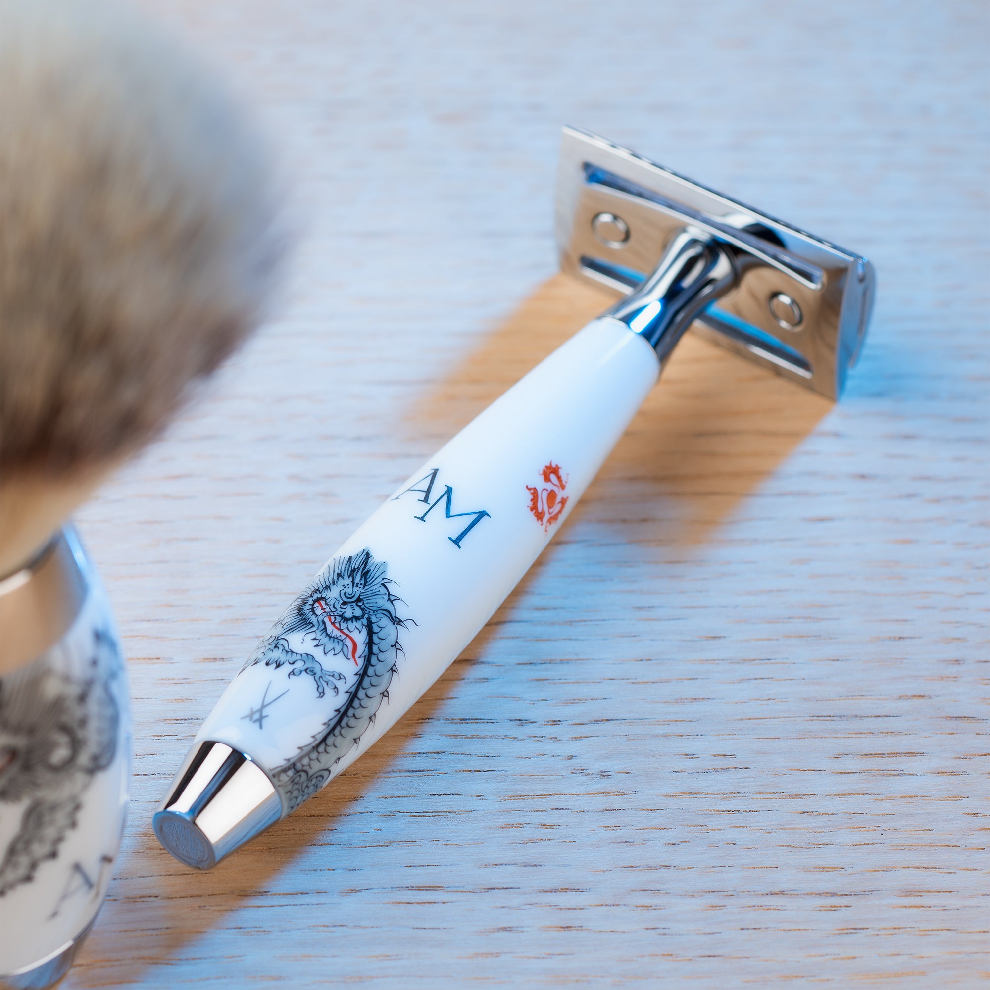Gullfallegt handmálað raksett frá Mühle. Handföngin eru úr Meissen postulíni sem á er handmálaður hinn frægi Ming dreki, tákn karlmannlegs styrkleika.