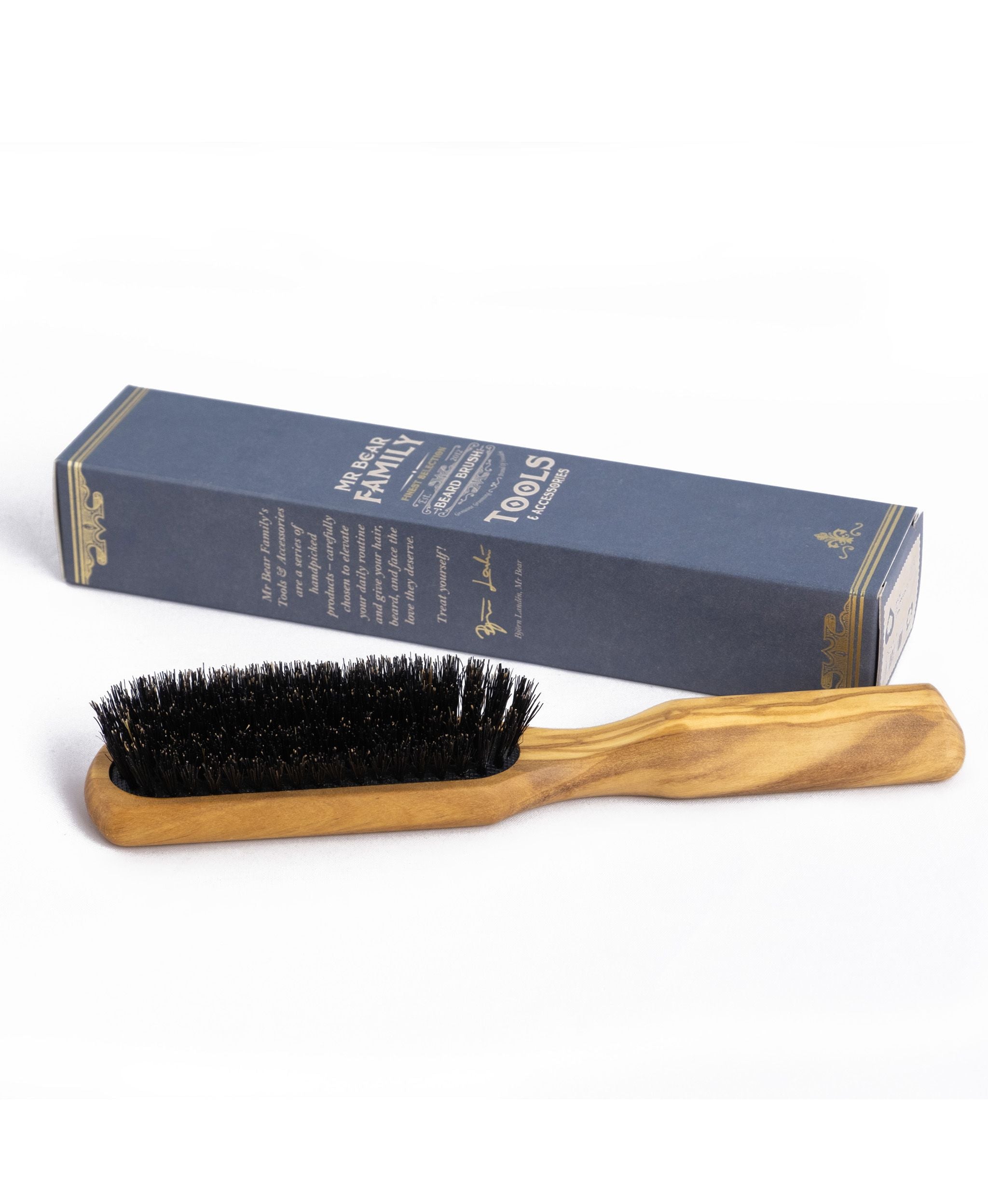 Skeggbursti með handfangi úr ólífuviði. Hárin eru svínshár sem er frábært til daglegrar skegghirðu og hjálpar til við að dreifa olíum og öðrum efnum jafnt um skeggið.